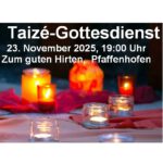 - Taizé-GottesdienstWir feiern das 65-jährige Jubiläum der Grundsteinlegung der evangelischen Kirche „Zum Guten Hirten“ in Pfaffenhofen. Den Abschluss der Feierlichkeiten bildet eine Taizé-Andacht am Sonntagabend 23.… Weiterlesen »Taizé-Gottesdienst