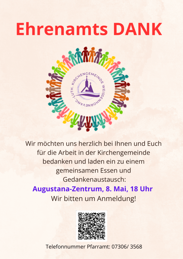 Unsere Ehrenamtlichen sind herzlich zu einem gemeinsamen Essen und Gedankenaustausch eingeladen: am 8. Mai um 18 Uhr im Augustana Gemeindezentrum. Wir bitten um Anmeldung im Pfarramt.