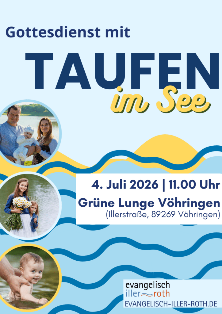 Am Samstag, dem 4. Juli 2026, um 11:00 Uhr, laden wir zu einer ganz besonderen Taufe ein. Wir feiern einen Gottesdienst inmitten der Natur, an der Grünen Lunge in Vöhringen, und taufen direkt im Wasser des Sees.