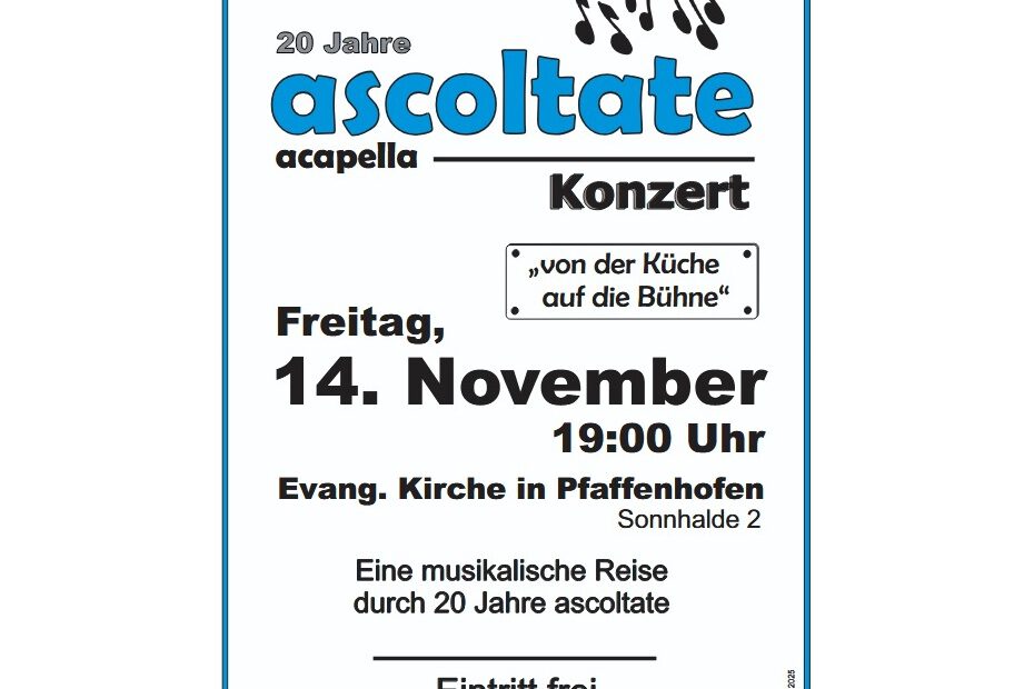 ascoltate – ein Chor aus Wullenstetten – lädt ein zu einer musikalischen Reise durch 20 Jahre ascoltate: „von der Küche auf die Bühne“. Am Freitag, den 14. November 2025 um 19 Uhr im Guten Hirten in Pfaffenhofen.