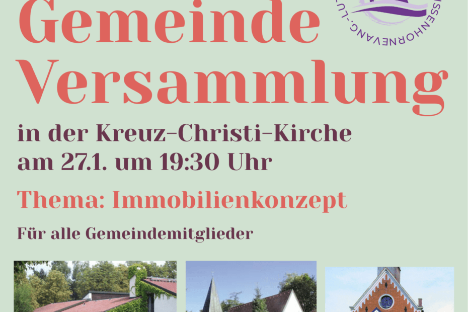 Herzliche Einladung zu unserer ersten Gemeindeversammlung am am Dienstag den 27.1. um 19:30 Uhr in die Kreuz-Christi-Kirche. Wir thematisieren die zukünftigen Veränderungen der Landeskirche im Bezug auf unsere Immobilien: Kirchen, Pfarrhaus, Augustana-Zentrum. Wie werden wir unser Gemeinde-Leben in die Zukunft… Weiterlesen »Gemeindeversammlung